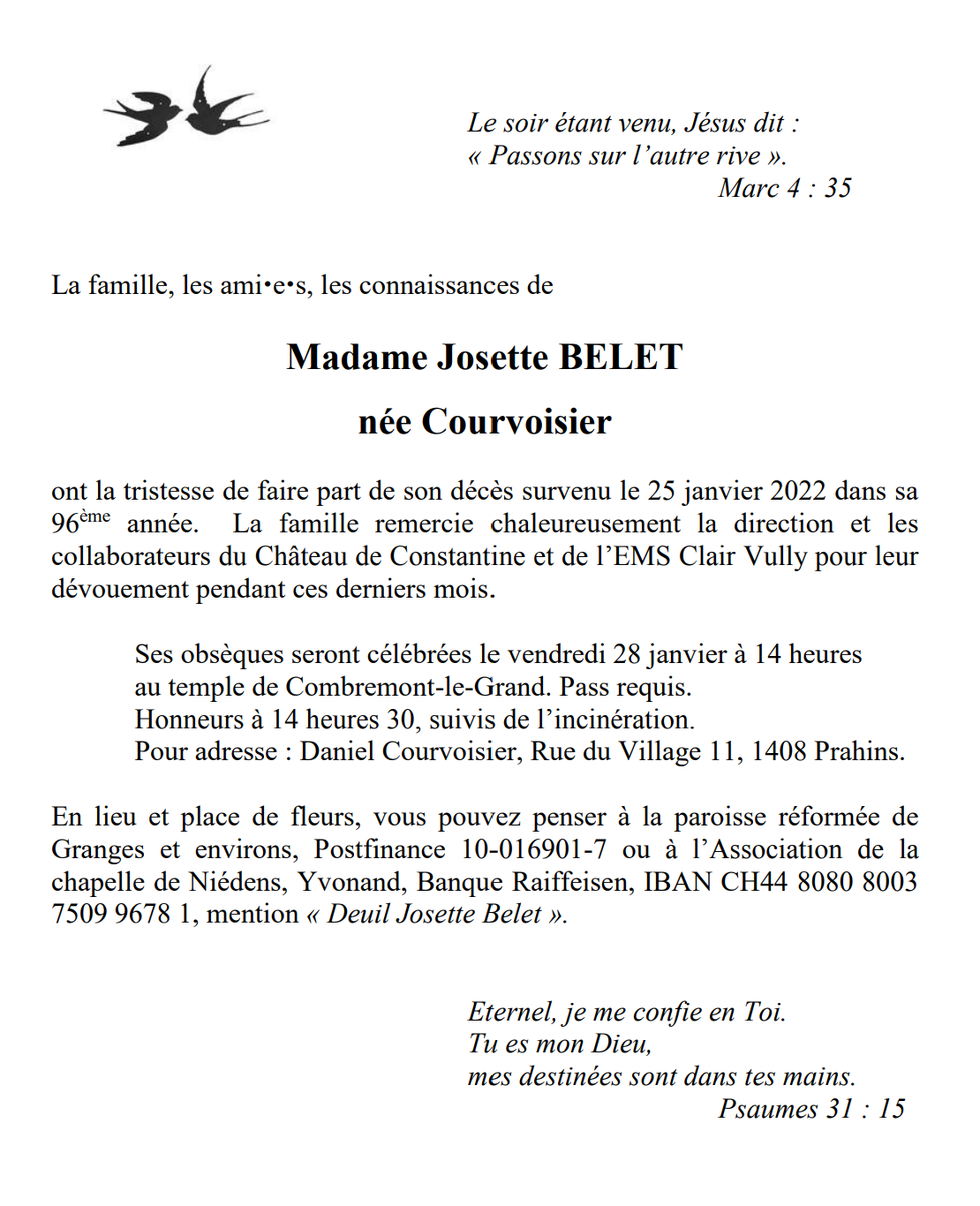 Madame Josette BELET 12 avr. 1926 - 25 jan. 2022 Avis mortuaire PFG Télecharger PDF Partager sur: Galerie PreviousNext PreviousNext