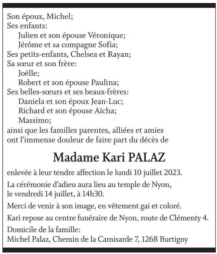 Madame Kari PALAZ 26 avr. 1966 - 10 juil. 2023 Avis mortuaire PFG Télecharger PDF Partager sur: Galerie PreviousNext PreviousNext