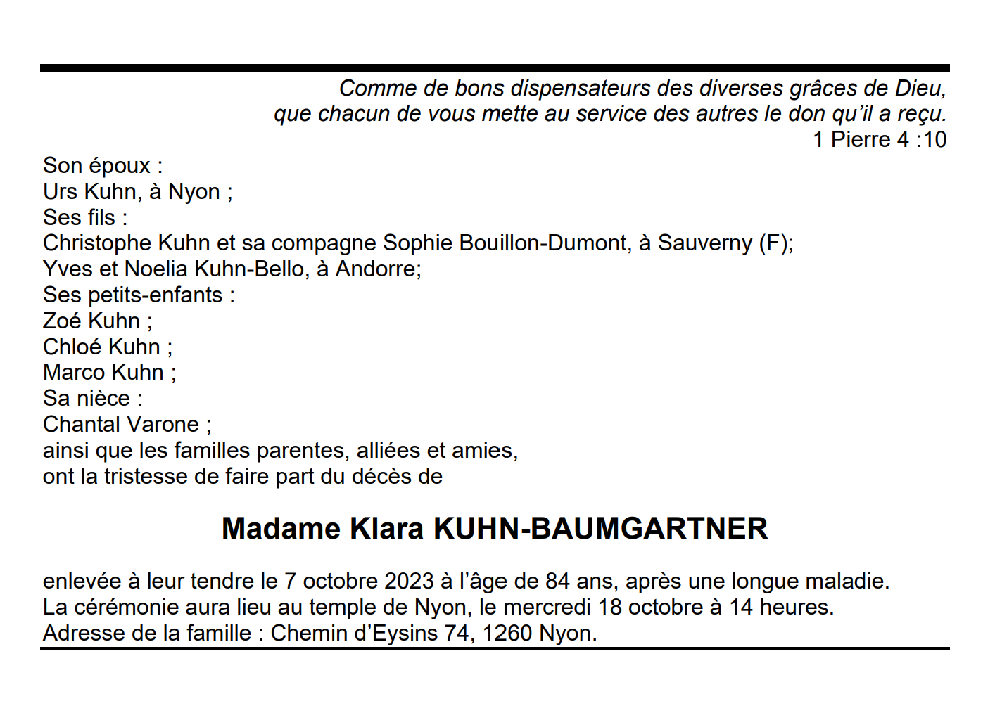 Madame Klara KUHN-BAUMGARTNER 01 juil. 1939 - 07 oct. 2023 Avis mortuaire PFG Télecharger PDF Partager sur: Galerie PreviousNext PreviousNext