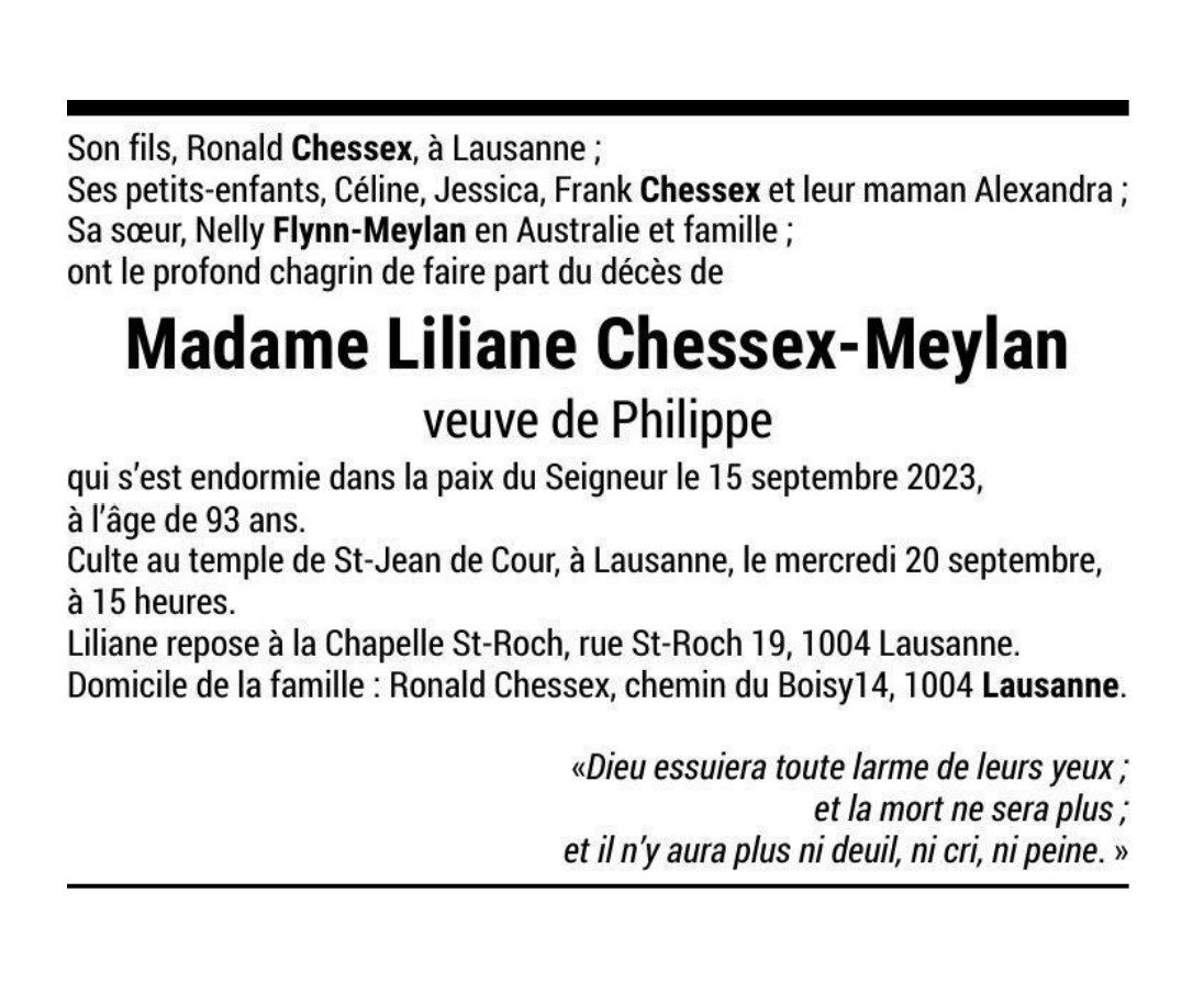Madame Liliane CAVIN-MEYLAN 06 avr. 1930 - 15 sep. 2023 Avis mortuaire PFG Télecharger PDF Partager sur: Galerie PreviousNext PreviousNext