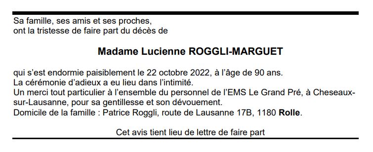 Madame Lucienne ROGGLI-MARGUET 20 mai. 1932 - 22 oct. 2022 Avis mortuaire PFG Télecharger PDF Partager sur: Galerie PreviousNext PreviousNext