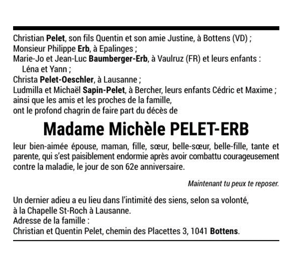 Madame Michèle PELET-ERB 02 oct. 1961 - 02 oct. 2023 Avis mortuaire PFG Télecharger PDF Partager sur: Galerie PreviousNext PreviousNext