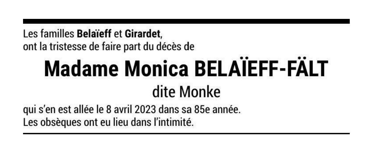 Madame Monica BELAÏEFF-FÄLT dit Monke 25 mai. 1938 - 08 avr. 2023 Avis mortuaire PFG Télecharger PDF Partager sur: Galerie PreviousNext PreviousNext