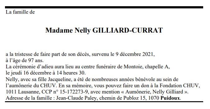 Madame Nelly GILLIARD-CURRAT 01 oct. 1924 - 09 déc. 2021 Avis mortuaire PFG Télecharger PDF Partager sur: Galerie PreviousNext PreviousNext