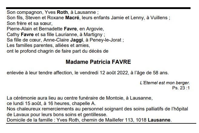 Madame Patricia FAVRE 28 sep. 1963 - 12 aoû. 2022 Avis mortuaire PFG Télecharger PDF Partager sur: Galerie PreviousNext PreviousNext