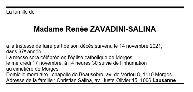 Madame Renée ZAVADINI-SALINA 05 juin. 1926 - 14 nov. 2021 Avis mortuaire PFG Télecharger PDF Partager sur: Galerie PreviousNext PreviousNext