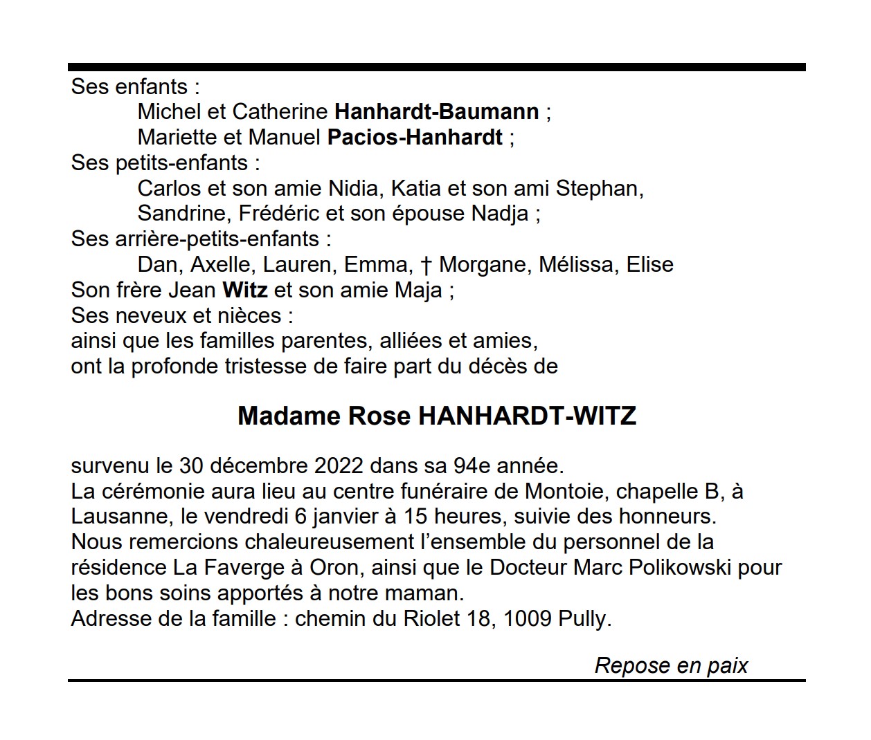Madame Rose HANHARDT-WITZ 23 juil. 1929 - 30 déc. 2022 Avis mortuaire PFG Télecharger PDF Partager sur: Galerie PreviousNext PreviousNext