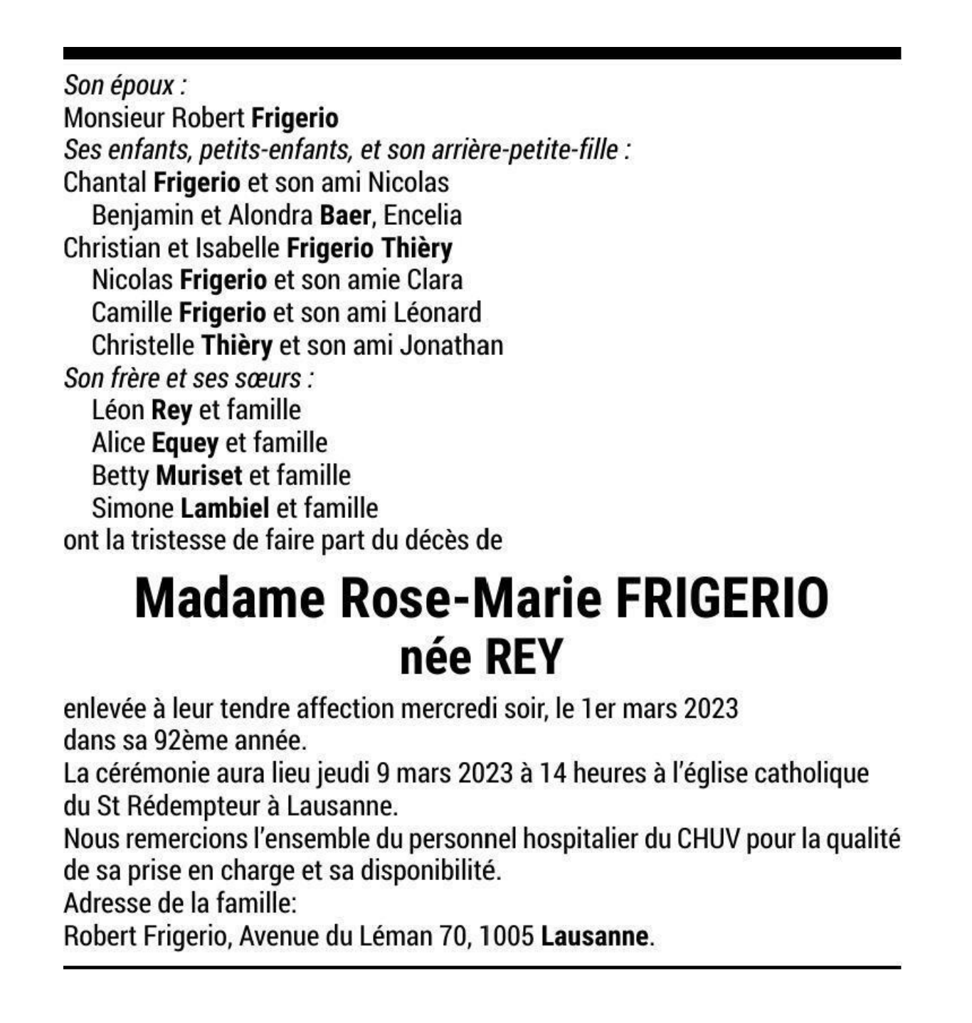 Madame Rose-Marie FRIGERIO née REY 13 oct. 1931 - 01 mar. 2023 Avis mortuaire PFG Télecharger PDF Partager sur: Galerie PreviousNext PreviousNext