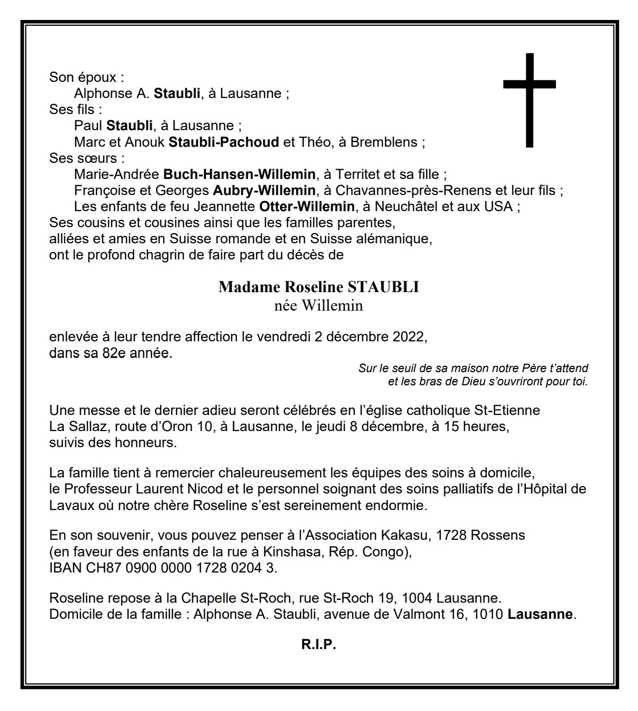 Madame Roseline STAUBLI 25 jan. 1941 - 02 déc. 2022 Avis mortuaire PFG Télecharger PDF Partager sur: Galerie PreviousNext PreviousNext