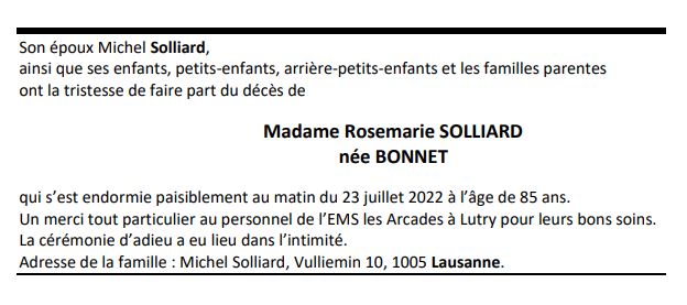 Madame Rosemarie SOLLIARD 04 sep. 1936 - 23 juil. 2022 Avis mortuaire PFG Télecharger PDF Partager sur: Galerie PreviousNext PreviousNext