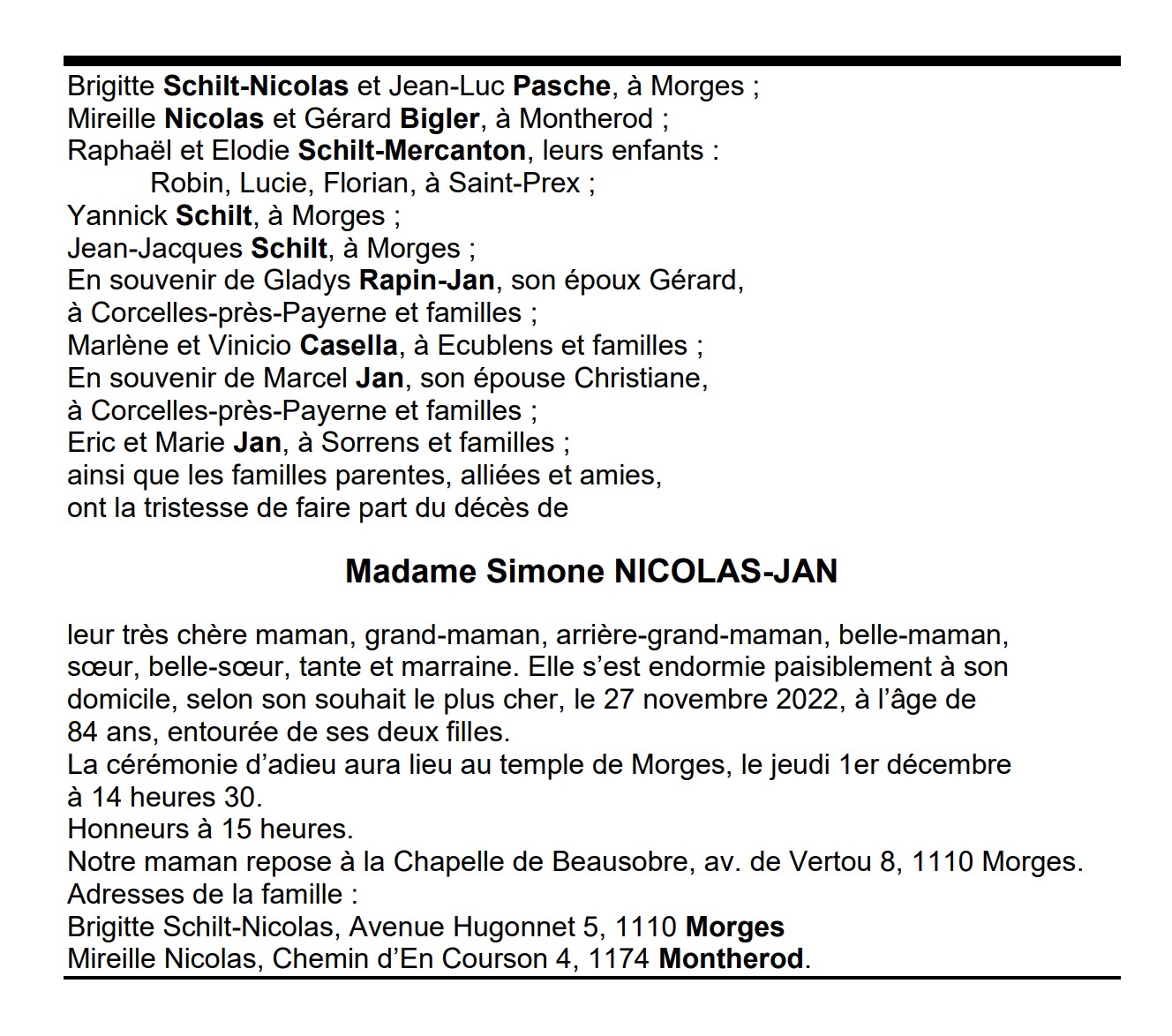Madame Simone NICOLAS-JAN 24 jan. 1938 - 27 nov. 2022 Avis mortuaire PFG Télecharger PDF Partager sur: Galerie PreviousNext PreviousNext