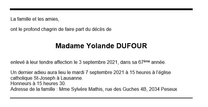Madame Yolande DUFOUR 28 juin. 1954 - 03 sep. 2021 Avis mortuaire PFG Télecharger PDF Partager sur: Galerie PreviousNext PreviousNext