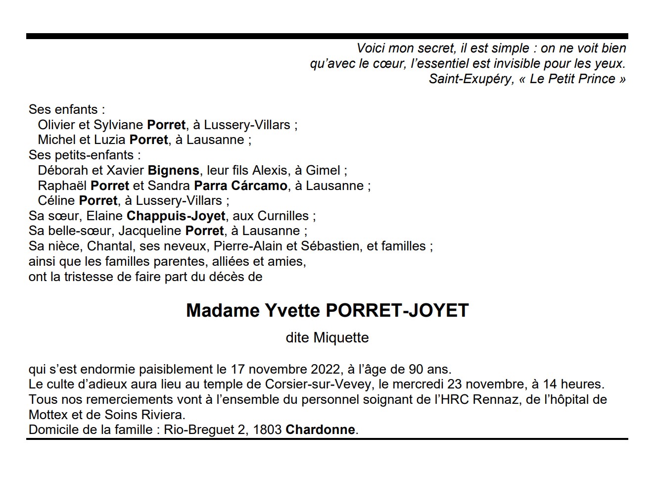 Madame Yvette PORRET-JOYET 01 mai. 1932 - 17 nov. 2022 Avis mortuaire PFG Télecharger PDF Partager sur: Galerie PreviousNext PreviousNext