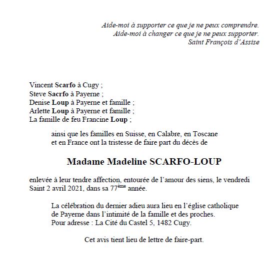 Madeline SCARFO-LOUP 15 juil. 1944 - 02 avr. 2021 Avis mortuaire PFG Télecharger PDF Partager sur: Galerie PreviousNext PreviousNext