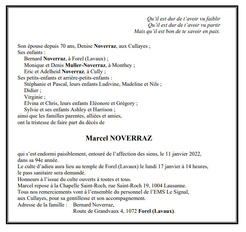 Marcel NOVERRAZ 29 juil. 1928 - 11 jan. 2022 Avis mortuaire PFG Télecharger PDF Partager sur: Galerie PreviousNext PreviousNext