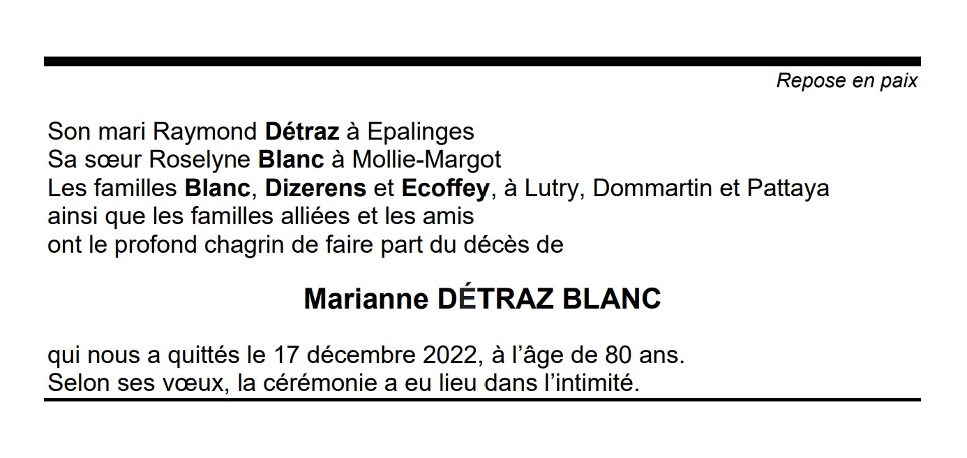 Marianne DÉTRAZ BLANC 03 mar. 1942 - 17 déc. 2022 Avis mortuaire PFG Télecharger PDF Partager sur: Galerie PreviousNext PreviousNext