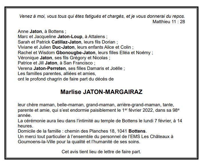 Marlise JATON-MARGAIRAZ 24 aoû. 1924 - 01 fév. 2022 Avis mortuaire PFG Télecharger PDF Partager sur: Galerie PreviousNext PreviousNext