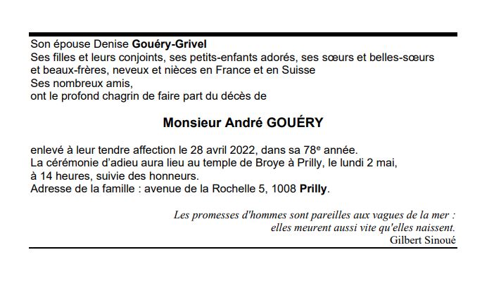 Monsieur André GOUÉRY 23 fév. 1945 - 28 avr. 2022 Avis mortuaire PFG Télecharger PDF Partager sur: Galerie PreviousNext PreviousNext
