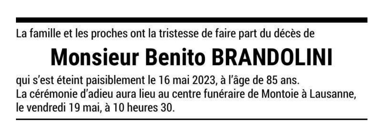 Monsieur Benito BRANDOLINI 06 avr. 1938 - 16 mai. 2023 Avis mortuaire PFG Télecharger PDF Partager sur: Galerie PreviousNext PreviousNext