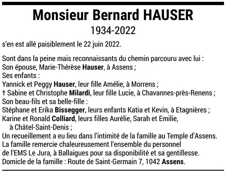 Monsieur Bernard HAUSER 17 nov. 1934 - 22 juin. 2022 Avis mortuaire PFG Télecharger PDF Partager sur: Galerie PreviousNext PreviousNext