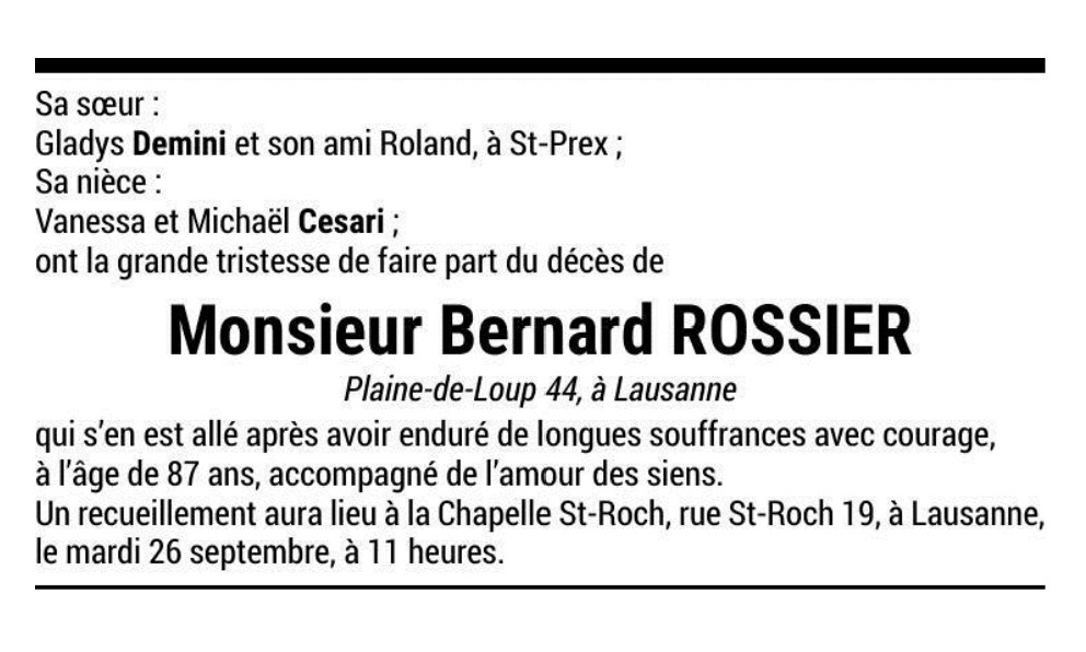 Monsieur Bernard ROSSIER 12 juil. 1936 - 19 sep. 2023 Avis mortuaire PFG Télecharger PDF Partager sur: Galerie PreviousNext PreviousNext