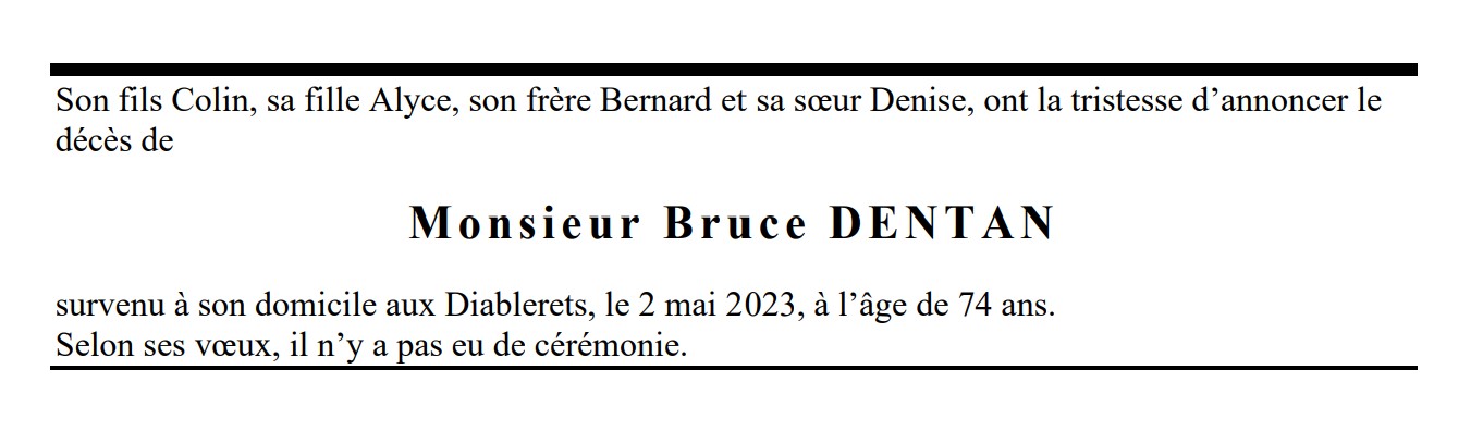 Monsieur Bruce DENTAN 28 déc. 1948 - 02 mai. 2023 Avis mortuaire PFG Télecharger PDF Partager sur: Galerie PreviousNext PreviousNext