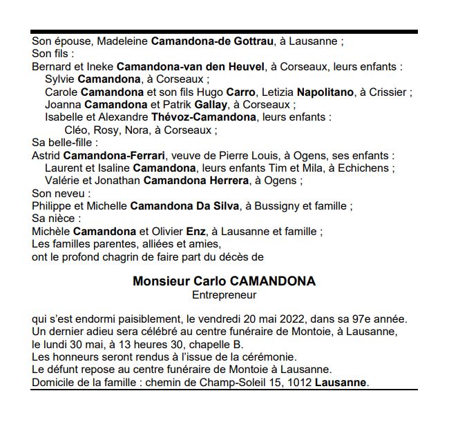 Monsieur Carlo CAMANDONA 19 mar. 1926 - 20 mai. 2022 Avis mortuaire PFG Télecharger PDF Partager sur: Galerie PreviousNext PreviousNext