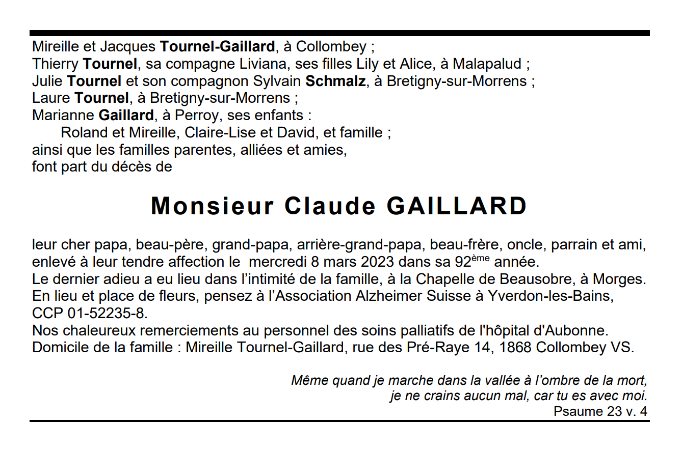 Monsieur Claude GAILLARD 08 avr. 1931 - 08 mar. 2023 Avis mortuaire PFG Télecharger PDF Partager sur: Galerie PreviousNext PreviousNext