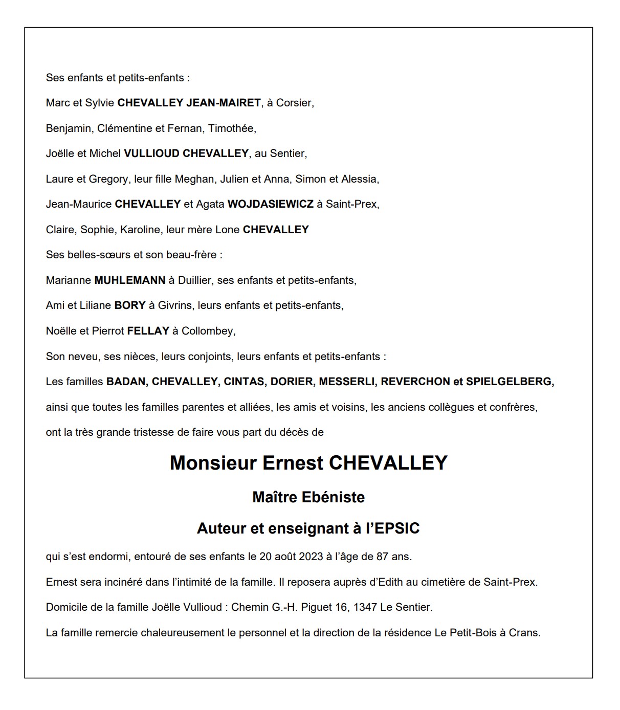 Monsieur Ernest CHEVALLEY Maître Ebéniste Auteur et enseignant à l’EPSIC