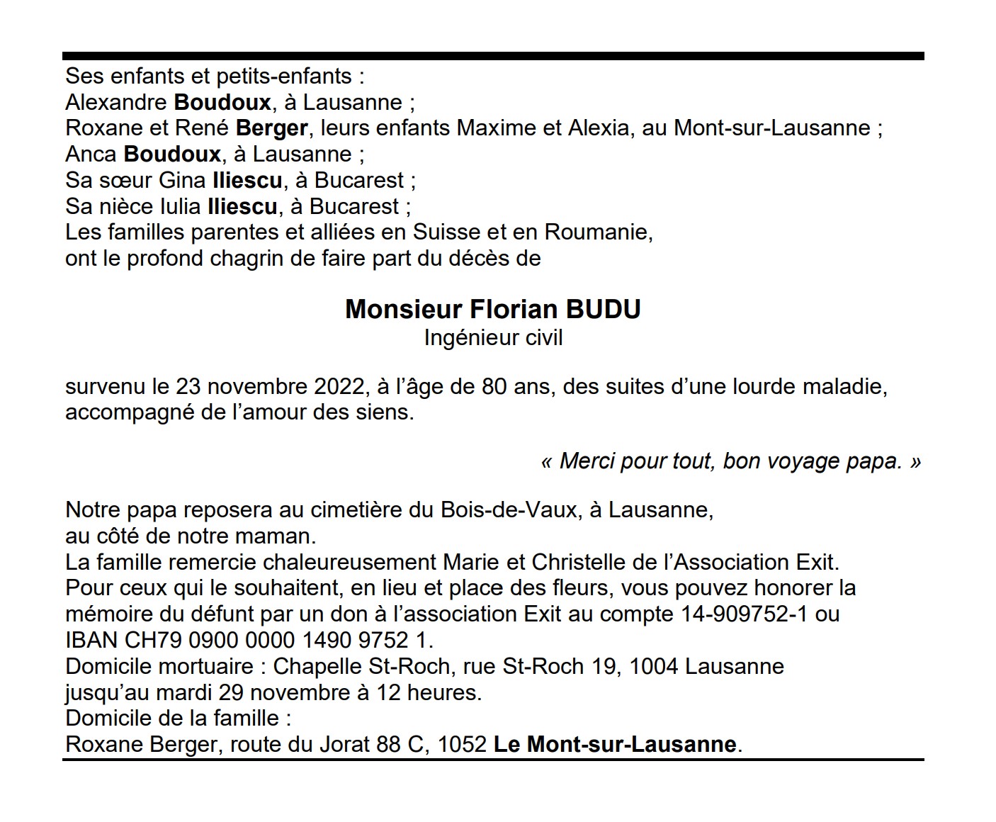 Monsieur Florian BUDU 02 mar. 1942 - 23 nov. 2022 Avis mortuaire PFG Télecharger PDF Partager sur: Galerie PreviousNext PreviousNext