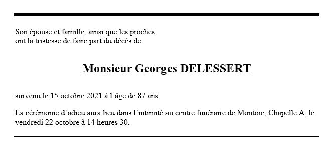Monsieur Georges DELESSERT 19 mar. 1934 - 15 oct. 2021 Avis mortuaire PFG Télecharger PDF Partager sur: Galerie PreviousNext PreviousNext