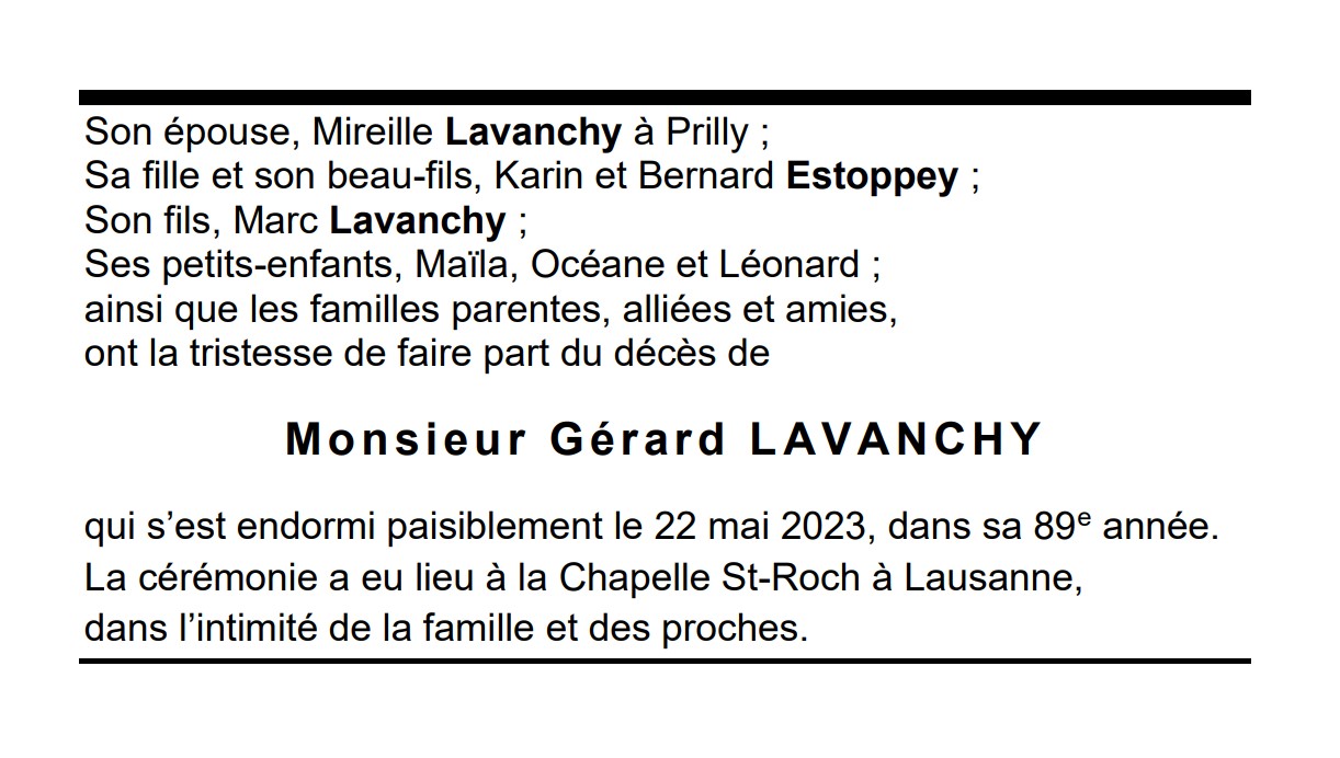 Monsieur Gérard LAVANCHY 17 mar. 1935 - 22 juin. 2023 Avis mortuaire PFG Télecharger PDF Partager sur: Galerie PreviousNext PreviousNext