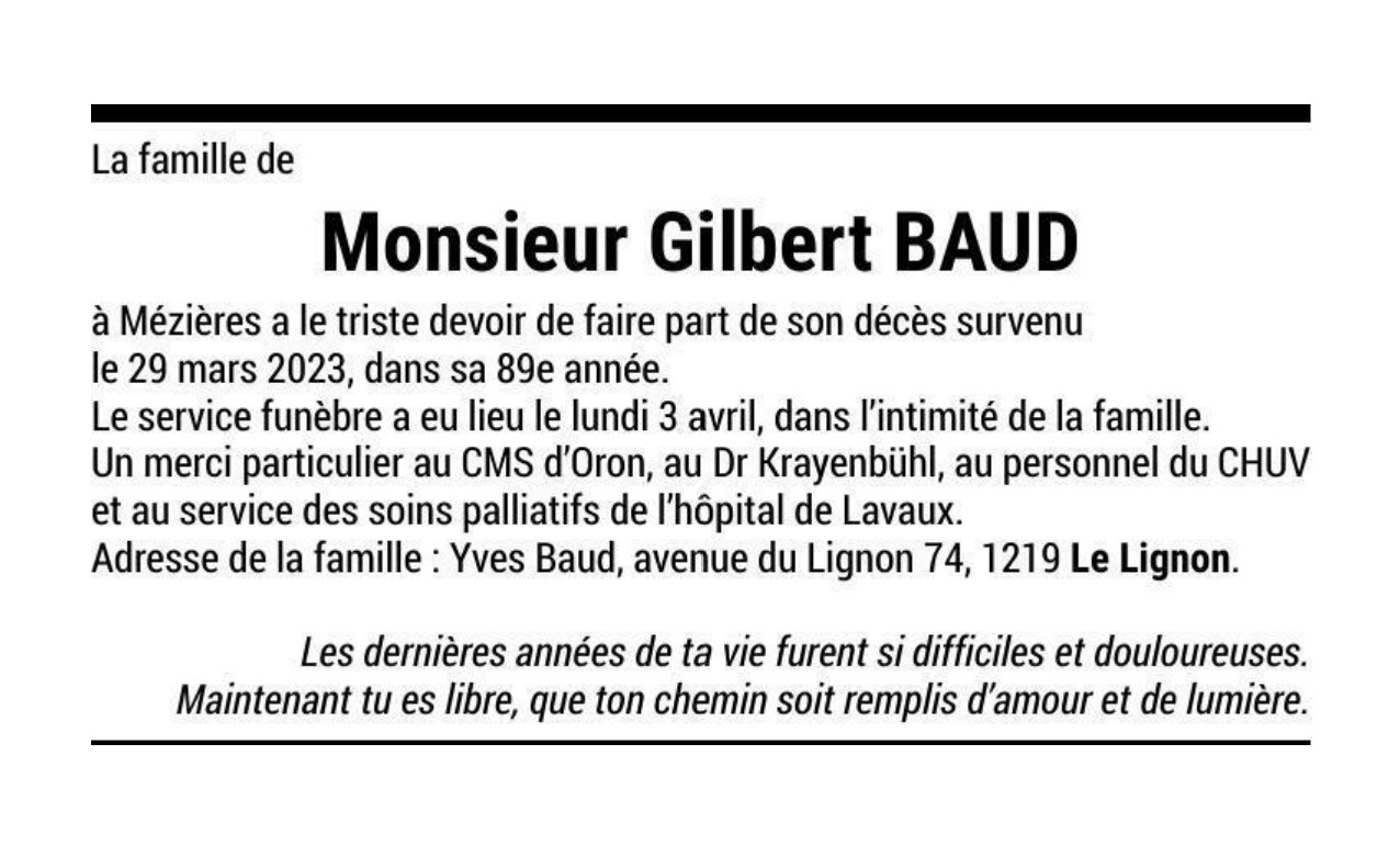 Monsieur Gilbert BAUD 04 déc. 1934 - 29 mar. 2023 Avis mortuaire PFG Télecharger PDF Partager sur: Galerie PreviousNext PreviousNext