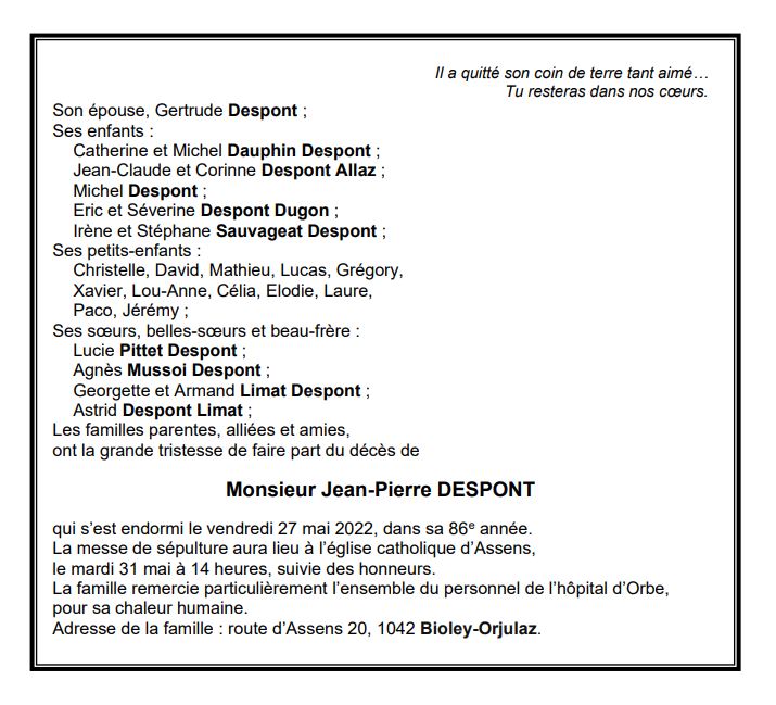 Monsieur Jean-Pierre DESPONT 19 fév. 1937 - 27 mai. 2022 Avis mortuaire PFG Télecharger PDF Partager sur: Galerie PreviousNext PreviousNext