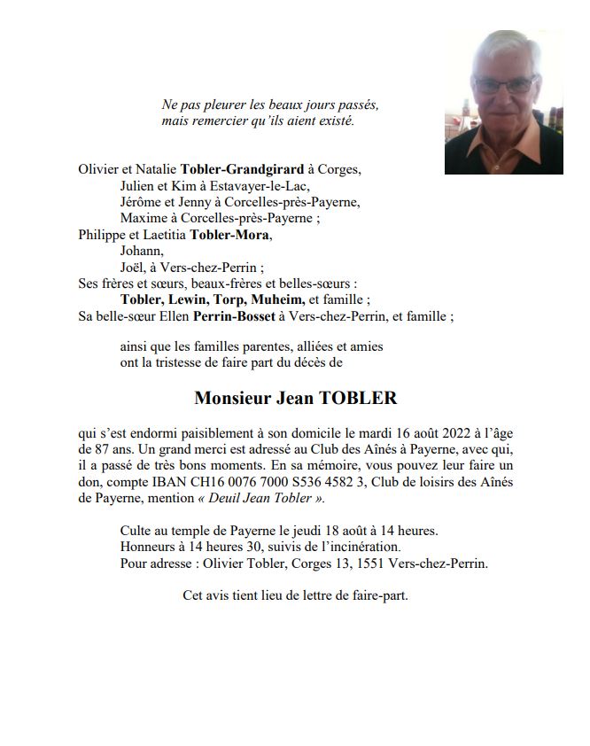 Monsieur Jean TOBLER 03 juin. 1935 - 16 aoû. 2022 Avis mortuaire PFG Télecharger PDF Partager sur: Galerie PreviousNext PreviousNext