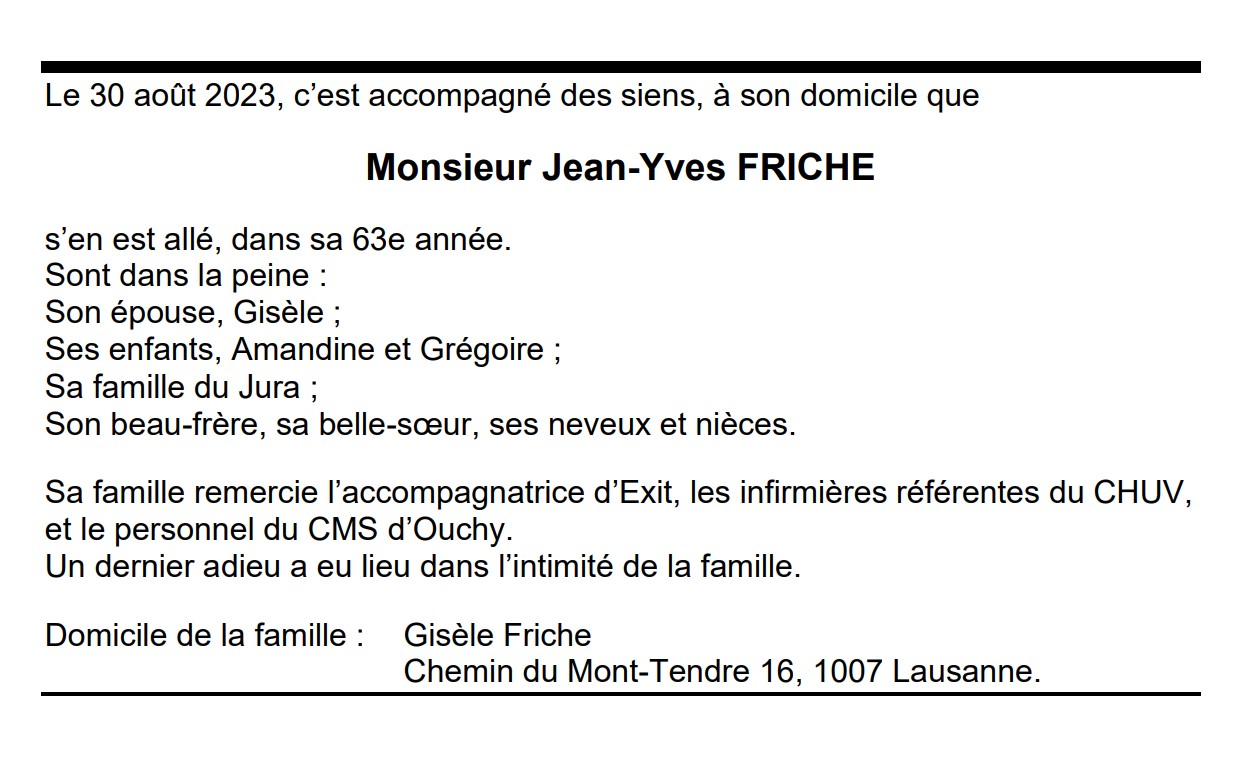 Monsieur Jean-Yves FRICHE 13 jan. 1961 - 30 aoû. 2023 Avis mortuaire PFG Télecharger PDF Partager sur: Galerie PreviousNext PreviousNext