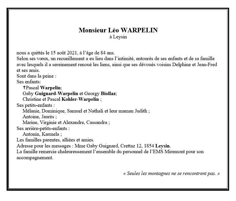 Monsieur Léo WARPELIN 21 juil. 1937 - 15 aoû. 2021 Avis mortuaire PFG Télecharger PDF Partager sur: Galerie PreviousNext PreviousNext