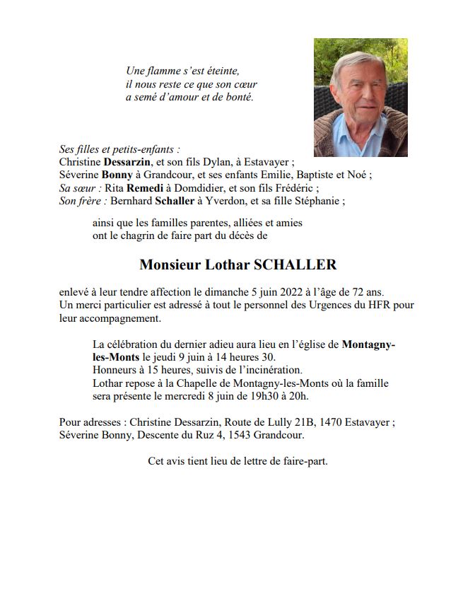 Monsieur Lothar SCHALLER 03 fév. 1950 - 05 juin. 2022 Avis mortuaire PFG Télecharger PDF Partager sur: Galerie PreviousNext PreviousNext