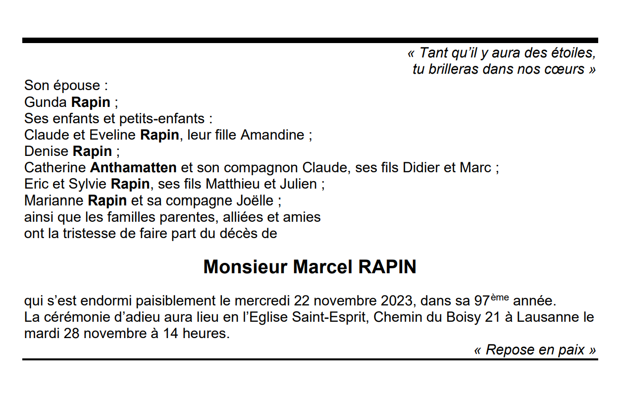 Monsieur Marcel RAPIN 06 déc. 1926 - 22 nov. 2023 Avis mortuaire PFG Télecharger PDF Partager sur: Galerie PreviousNext PreviousNext
