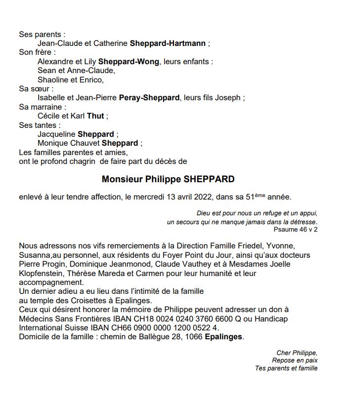Monsieur Philippe SHEPPARD 01 oct. 1971 - 13 avr. 2022 Avis mortuaire PFG Télecharger PDF Partager sur: Galerie PreviousNext PreviousNext