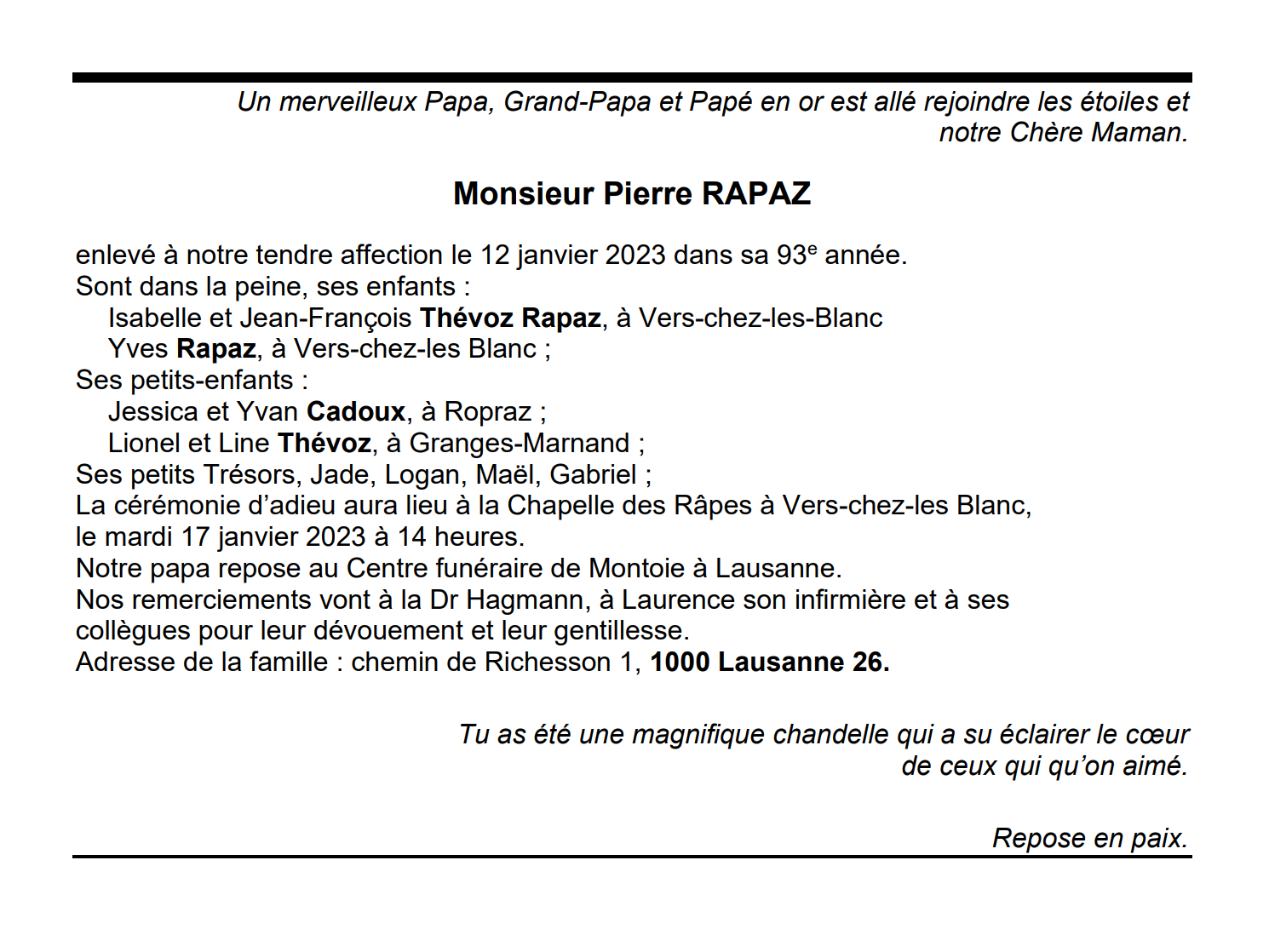 Monsieur Pierre RAPAZ 04 avr. 1930 - 12 jan. 2023 Avis mortuaire PFG Télecharger PDF Partager sur: Galerie PreviousNext PreviousNext