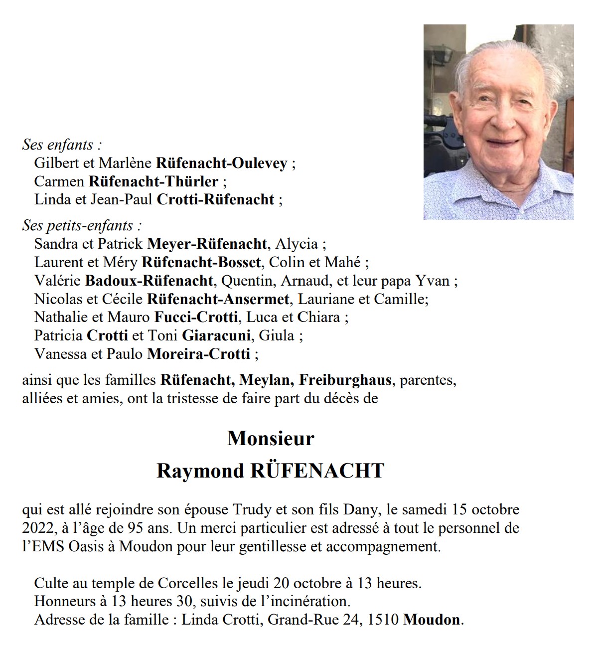 Monsieur Raymond RÜFENACHT 04 juil. 1927 - 15 oct. 2022 Avis mortuaire PFG Télecharger PDF Partager sur: Galerie PreviousNext PreviousNext