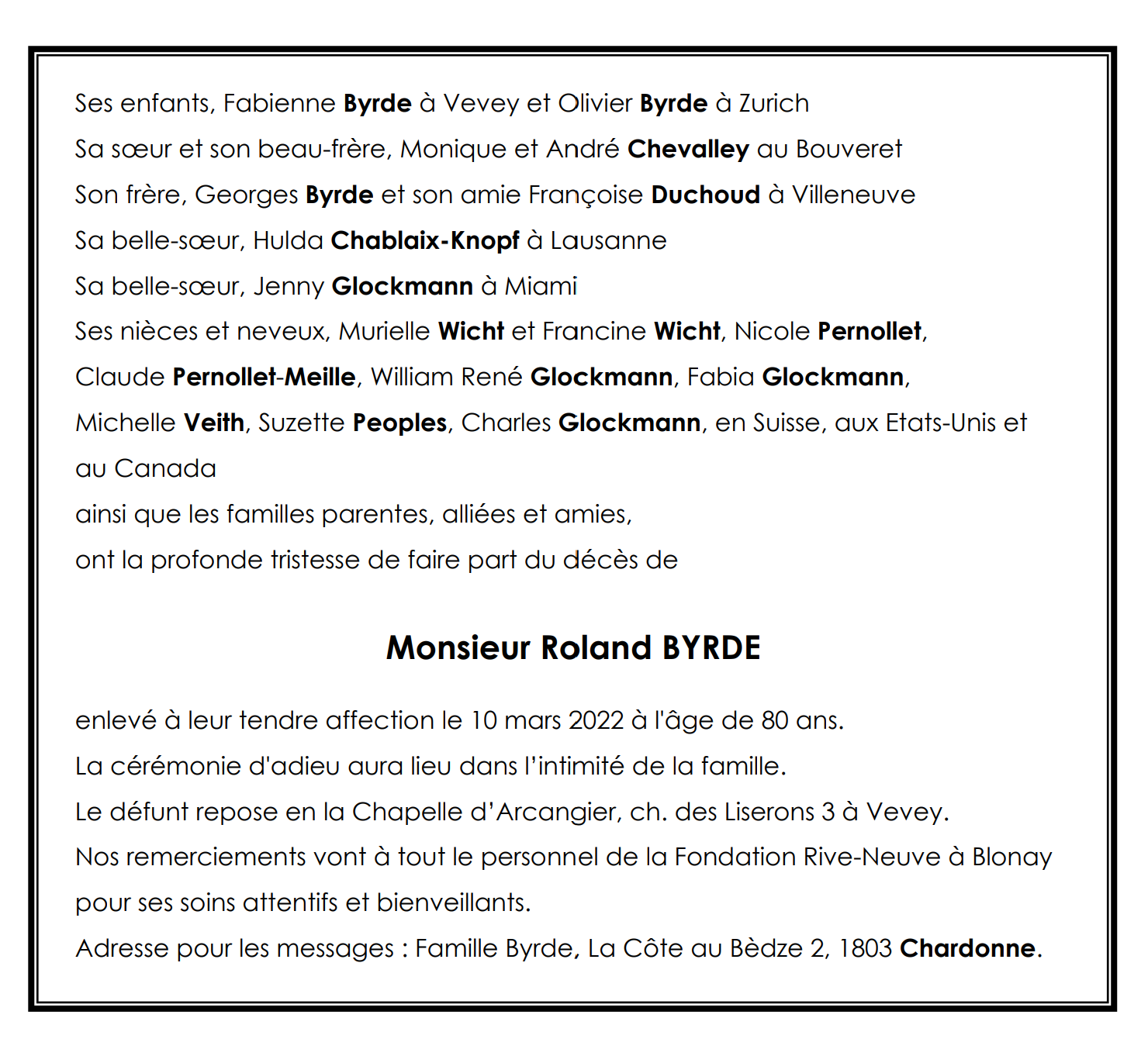 Monsieur Roland BYRDE 13 jan. 1942 - 10 mar. 2022 Avis mortuaire PFG Télecharger PDF Partager sur: Galerie PreviousNext PreviousNext