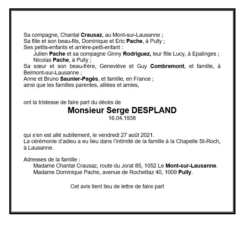 Monsieur Serge DESPLAND 16 avr. 1938 - 27 aoû. 2021 Avis mortuaire PFG Télecharger PDF Partager sur: Galerie PreviousNext PreviousNext