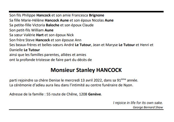 Monsieur Stanley HANCOCK 18 aoû. 1931 - 13 avr. 2022 Avis mortuaire PFG Télecharger PDF Partager sur: Galerie PreviousNext PreviousNext