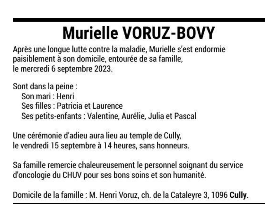 Murielle VORUZ-BOVY 28 mai. 1948 - 06 sep. 2023 Avis mortuaire PFG Télecharger PDF Partager sur: Galerie PreviousNext PreviousNext