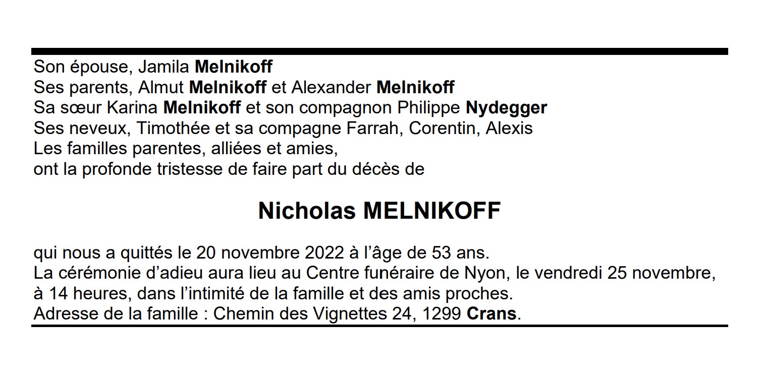 Nicholas MELNIKOFF 29 jan. 1969 - 20 nov. 2022 Avis mortuaire PFG Télecharger PDF Partager sur: Galerie PreviousNext PreviousNext