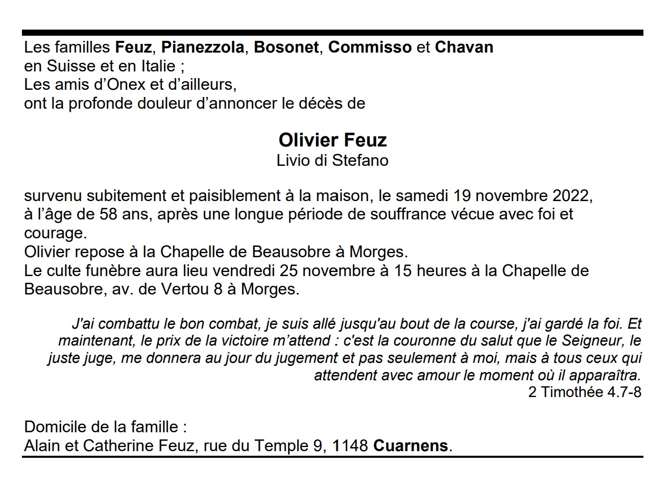 Olivier Feuz 06 fév. 1964 - 19 nov. 2022 Avis mortuaire PFG Télecharger PDF Partager sur: Galerie PreviousNext PreviousNext
