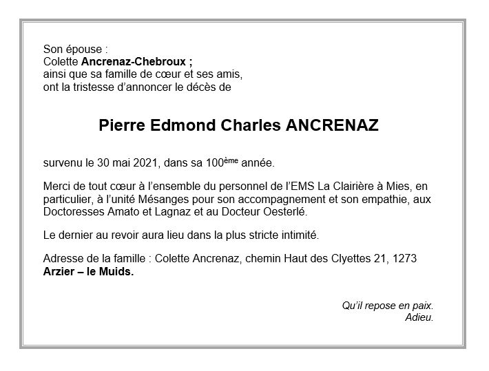 Pierre ANCRENAZ 22 mar. 1922 - 30 mai. 2021 Avis mortuaire PFG Télecharger PDF Partager sur: Galerie PreviousNext PreviousNext