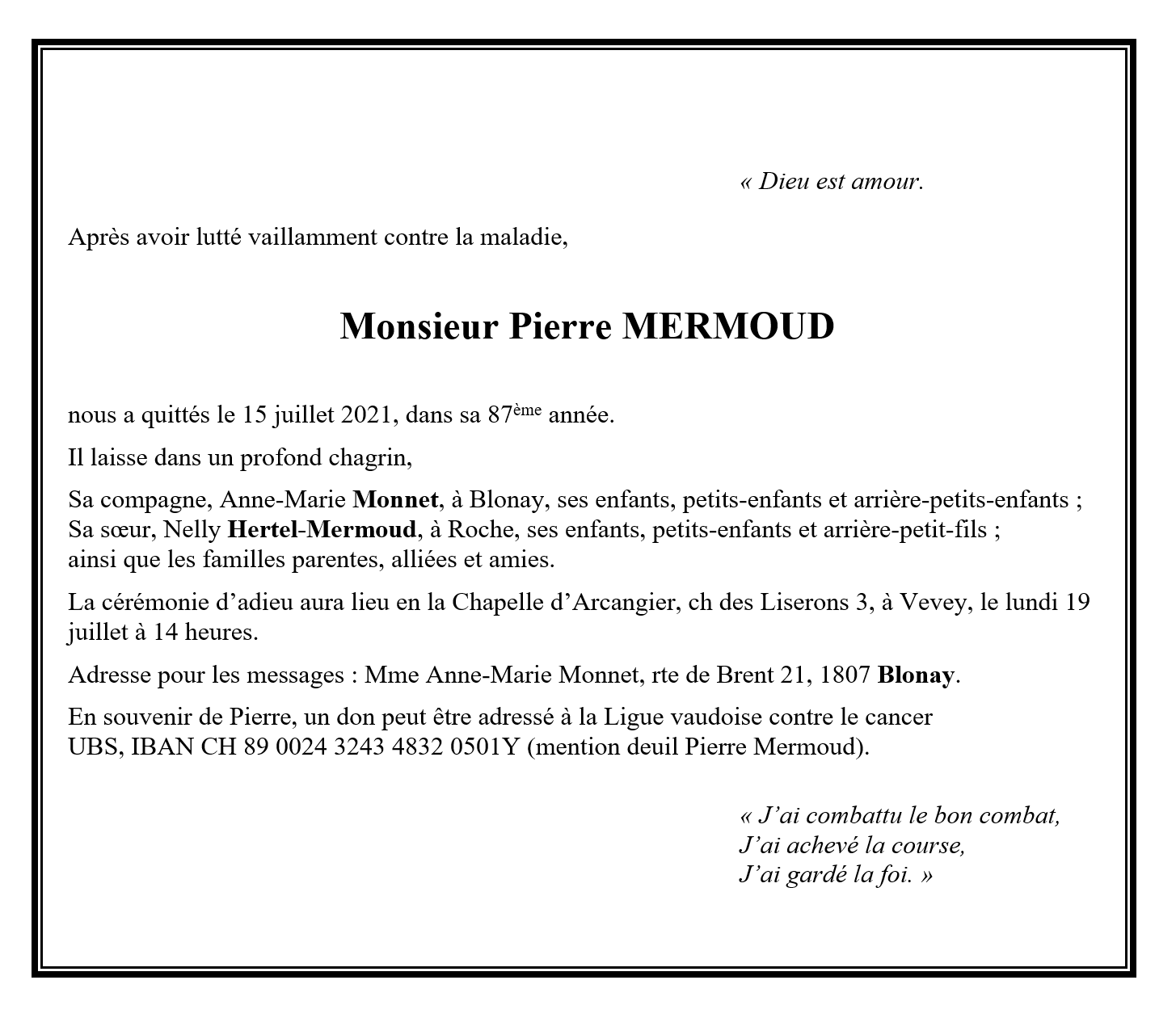 Pierre MERMOUD 28 sep. 1934 - 15 juil. 2021 Avis mortuaire PFG Télecharger PDF Partager sur: Galerie PreviousNext PreviousNext